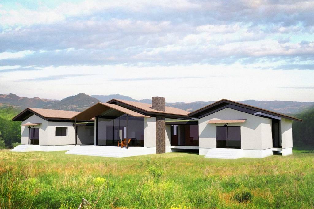 This home will feature two elevated “bridge” sections connecting the three main gabled portions of the house. It will also include a green vegetative roof. It is oriented to take advantage of gorgeous views overlooking vineyards and a river valley.